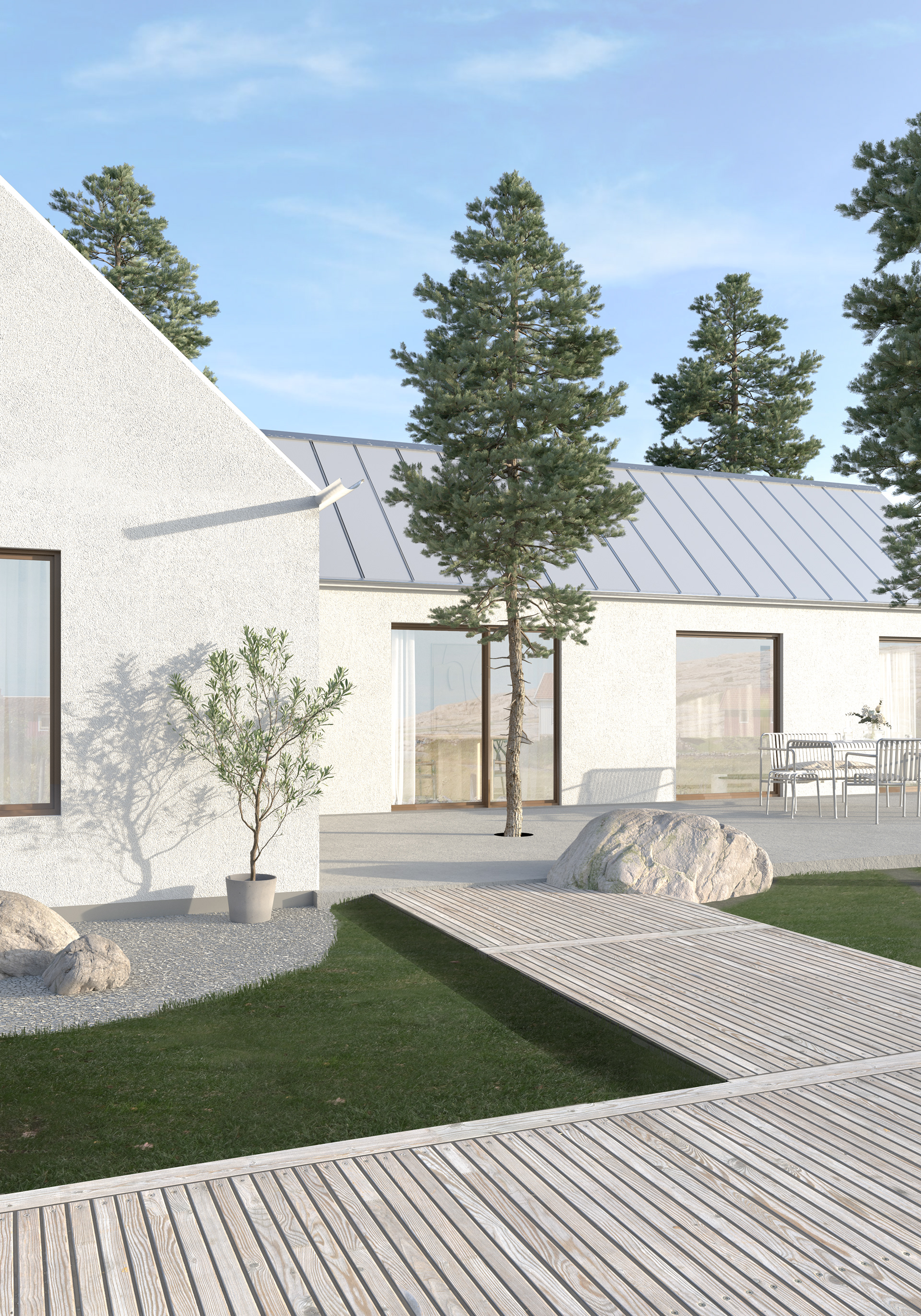 Samma villa, men här i en somrig version med en ny utformning av uteplatsen. Genom att justera material, färger och ljussättning skapades en varmare och mer inbjudande känsla som fångar sommarens ljusa och livfulla atmosfär. Uteplatsen har designats om för att smälta bättre in i naturen och samtidigt vara en bekväm och trivsam plats för både avkoppling och umgänge.